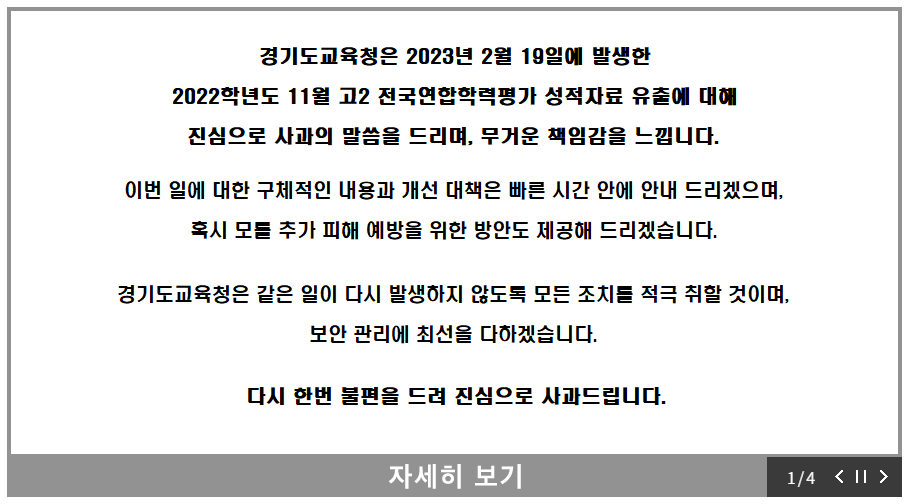 현재 경기도교육청 홈페이지에 가면 아래와 같이 팝업창이 뜨고 있습니다. 이번 사안을 무겁게 인지하고 적극적으로 대응하고 있는 경기도 교육청에서 아무쪼록 2차 피해를 막고 재발 방지 노력을 기울여주면 좋겠습니다. 또한 2023년 4월에도 경기도교육청 주관으로 전국연합학력평가 있을 예정인데, 모의고사 일정에 변동은 없기를 바랍니다.
