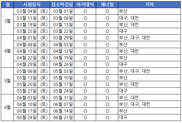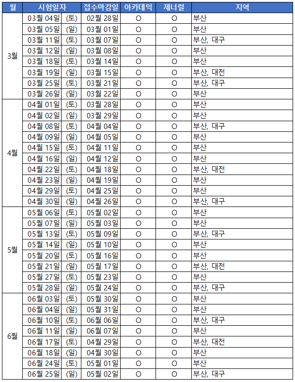 서울지역은 월요일을 제외하고 매일 시험 일정이 있습니다. 아래 표는 서울 이외 지역의 시험 일정이며, 접수마감일은 시험 4일전입니다.