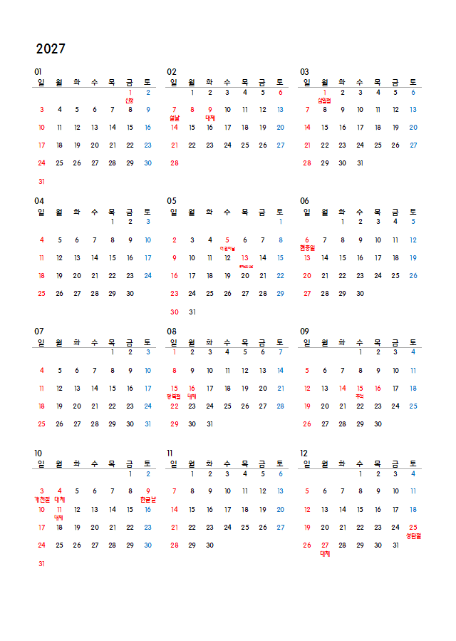 - 2026년 공휴일이 너무 적어서 극도의 우울함에서 벗어나고자 2027년 공휴일을 미리 확인하고 싶은 분