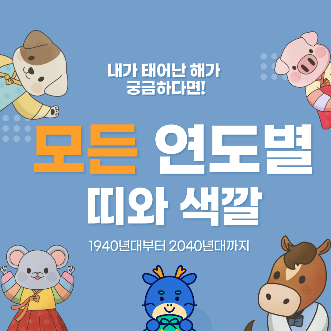 2024년은 갑진년! 청룡의 해라고 합니다. 푸른 용의 해라고 하니 멋진 일들이 많이 있을 것 같은 기대가 되는데요, 우리가 알고 있던 십이간지 띠 앞에 이렇게 색깔이 붙은 것을 알고 계시나요? 여러분들의 띠와 색깔을 찾아보세요! 음력생일을 몰라도 됩니다! 아래에 정리해두었어요!