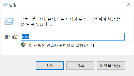 아래 그림처럼 실행창에 calc 를 누르고 확인 또는 enter 키를 누르면, 오른쪽처럼 계산기가 짠! 나타난다.