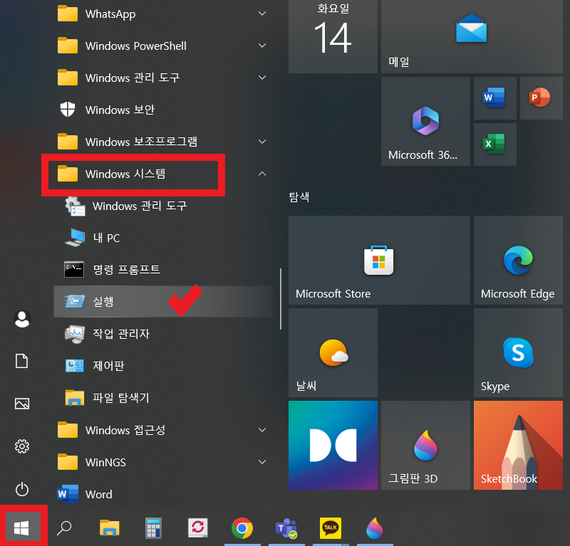 2. 시작메뉴에서 window system 클릭, Run 클릭해도 실행창이 나타난다